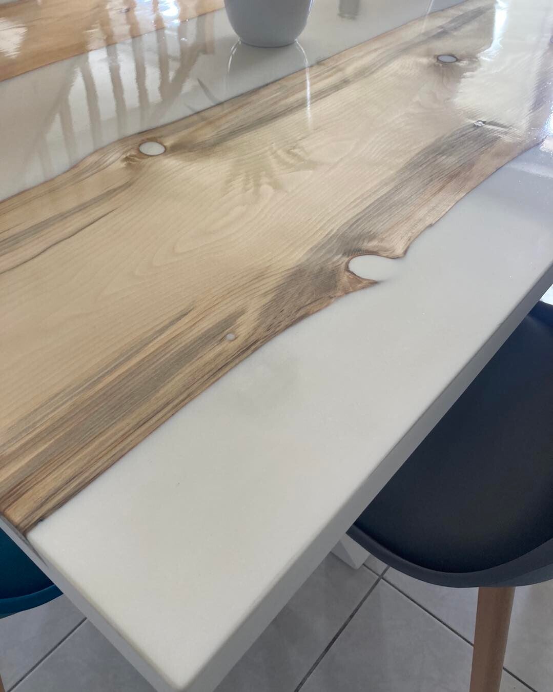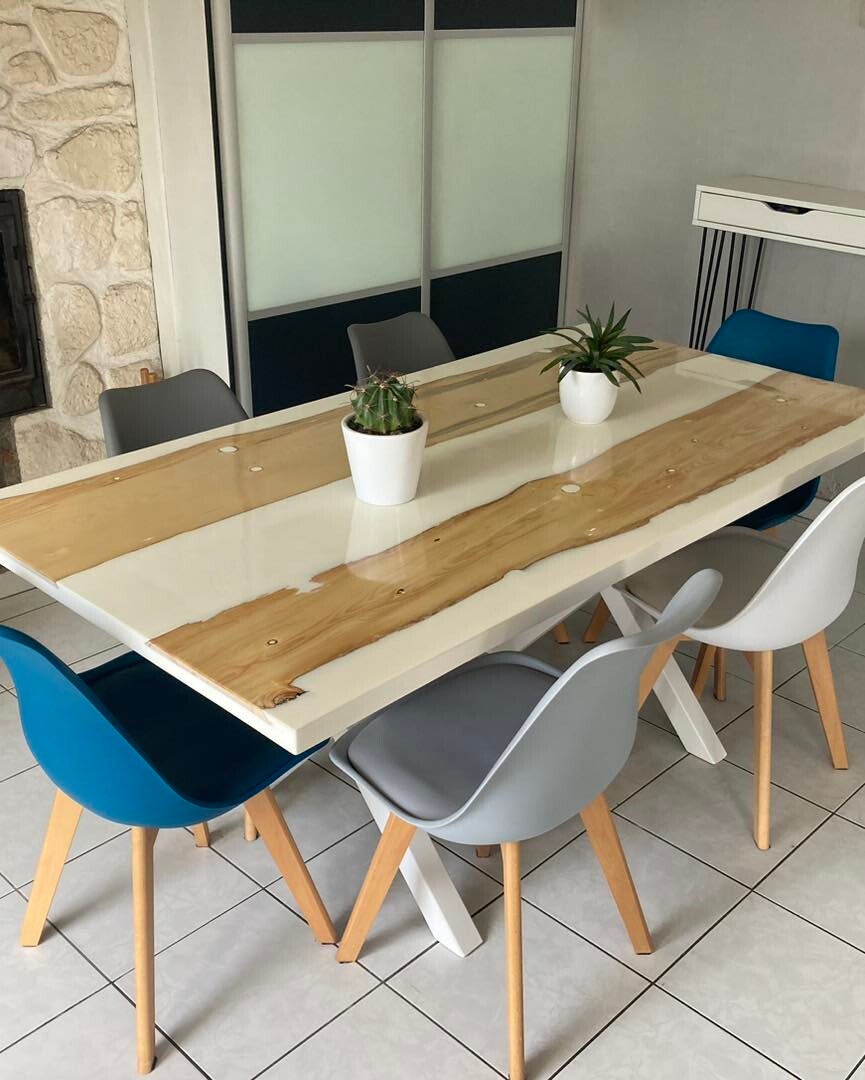 Réalisation d'une table de salle a manger sur mesure en résine de coulée avec des inserts en bois.